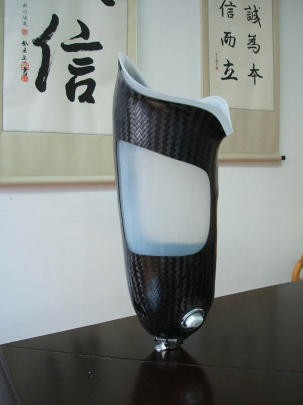 一些所謂的“高檔”小腿假肢,雖然使用了非常優(yōu)質昂貴的材料,但也沒有做到全接觸,更談不上殘端承重。殘肢末端與接受腔底之間巨大的空間,是造成殘端變色瘀腫的根本原因。只要在穿上內襯套后輕按底端,截肢者很容易便可知道接受腔是否做到了全接觸。一些截肢者自發(fā)地在接受腔底部墊上棉絲,來保持與殘肢的接觸和壓力。他們對全接觸的認識已經超過了假肢技術人員。昂貴的材料并不能代表高檔的假肢質量。